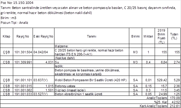 Örneğin: poz numarası 15.150.1004 ve tamını “Beton santralinde üretilen veya satın alınan ve beton pompasıyla basılan, C 20/25 basınç dayanım sınıfında, gri renkte, normal hazır beton dökülmesi (beton nakli dahil)” olan sıklıkla kullanılan C20 hazır beton birim fiyatını ele alalım. Listede metre küp fiyatı olarak 212,61 TL göreceğiz. (2019 fiyatlarıdır)